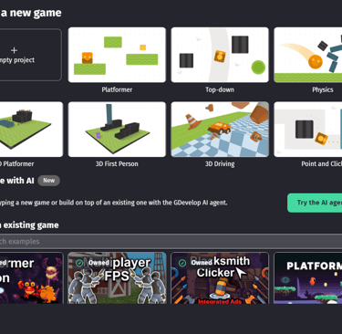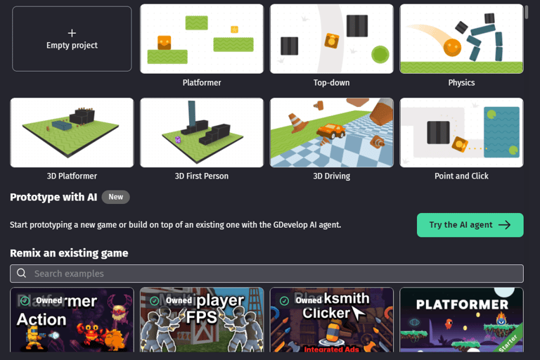 Pick a Template – Choose a starter like Platformer, Shooter, or Endless Runner. These come with ready-made mechanics you can study and modify.