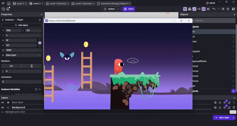 Export and Share – With one click, you can export for web, desktop, mobile or directly to itch.io or GDevelop Games